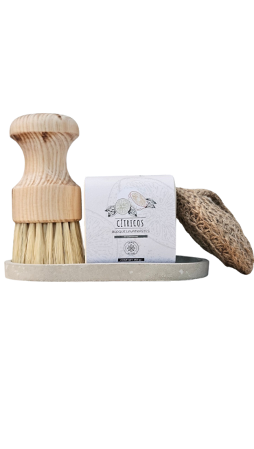 Los accesorios como el cepillo de fibra natural y la jabonera de cemento son resistentes, reutilizables y de larga duración, ideales para un consumo responsable.
